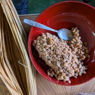 さて藁納豆のインプレです。まず開封。というか藁が上下で束ねられているだけなので、胴体部分の紐をほどいて上下の結び目を合わせるように折り曲げると、中身が顔を出だします。謳い文句通りに、装飾としての藁包装でないようです。つまり包装だけなら中袋と...