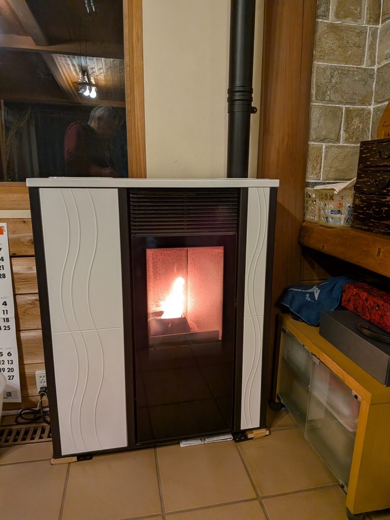 このイタリア製のペレットストーブはエアコンのように室温設定で燃える。だから薪ストーブの援護があると・・・弱燃焼。薪ストーブの火力が落ちてから段々パワーを自動的に上げてくる。