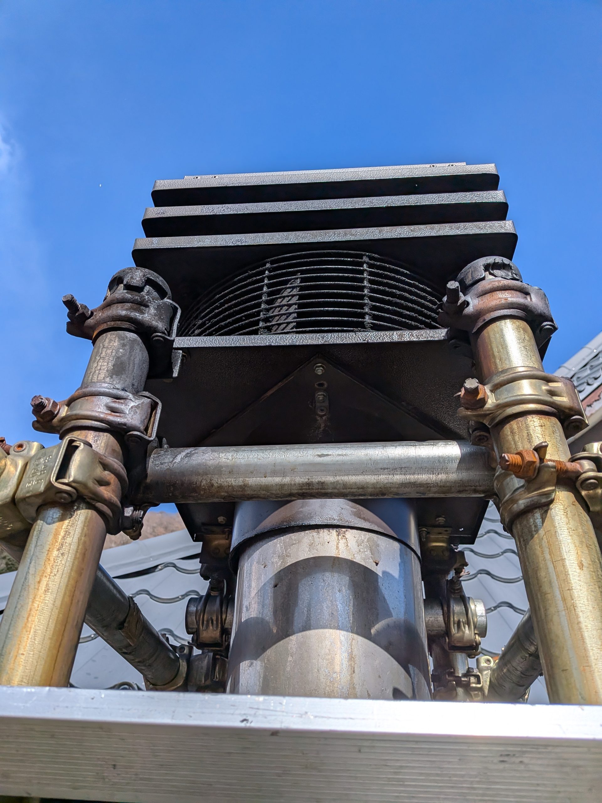 物置等に囲まれており、最低でも軒の高さ以上に煙突トップは置きたかったので、架台は4mの単管パイプを使用した。1件目は鉄アングルを鉄工所で箱型に作ってもらって櫓構造としのだ。床がコンクリートだったので、アンカーボルトで固定しやすかったこともある。が今回は地面なので、埋め込み最後に現場で練ったコンクリートを流し込んだ。