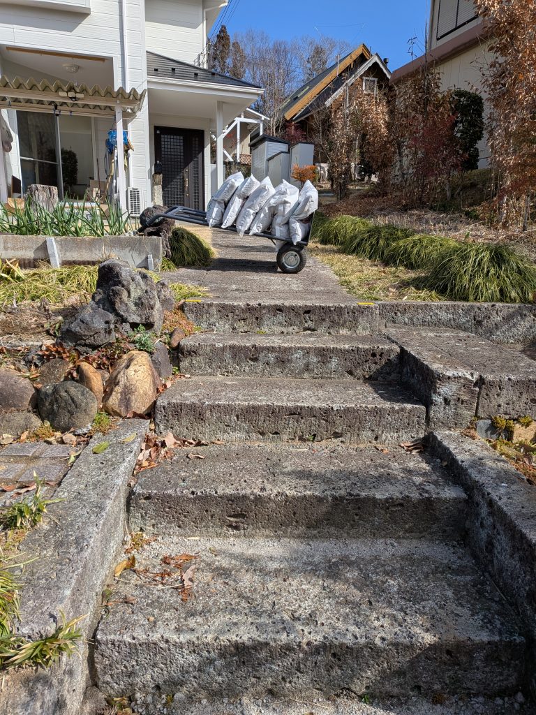 大谷石の階段を10段上がって、斜面のスロープが20m位あって、その先にやっと物置。