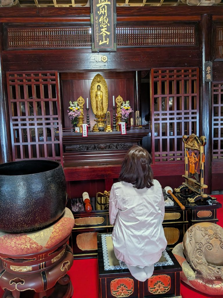 その気になって、お坊さんになった気分で生まれて初めて木魚や鐘を叩く妻↓