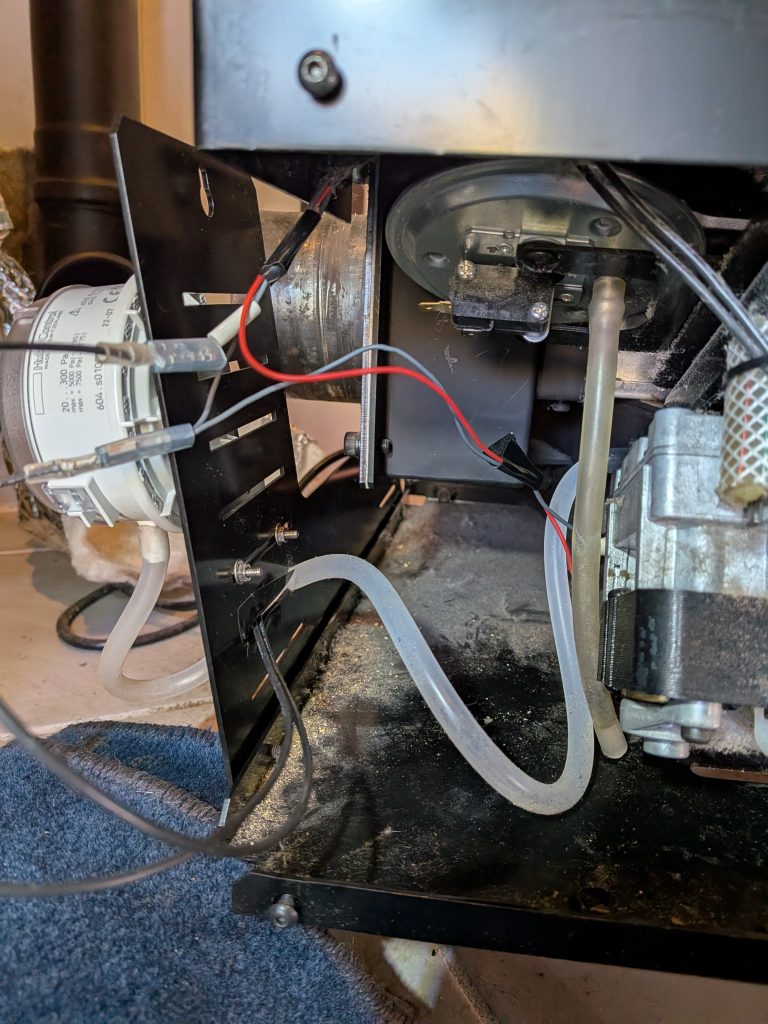 今回の場合 「負圧センサーエラー」とストーブが言ってます。これは燃焼のために空気を送っているファン自体の異常か、排気経路が詰まり気味で出る表示です。通常の燃焼までは行くので燃焼ファンモーターは問題ないみたい。